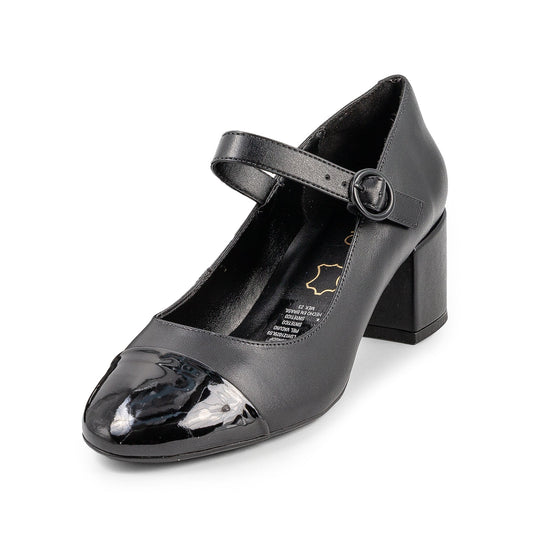 Estilo clásico con brillo moderno- El modelo Mary Jane se renueva con una puntera acharolada...