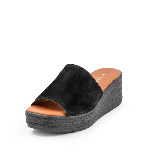 Minimalismo con textura- Esta plataforma de corte tipo mule destaca por su exterior afelpado que...