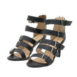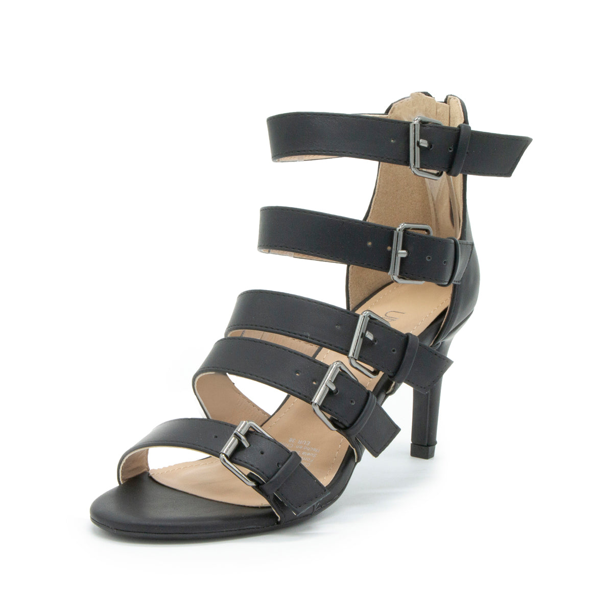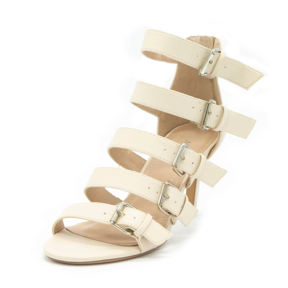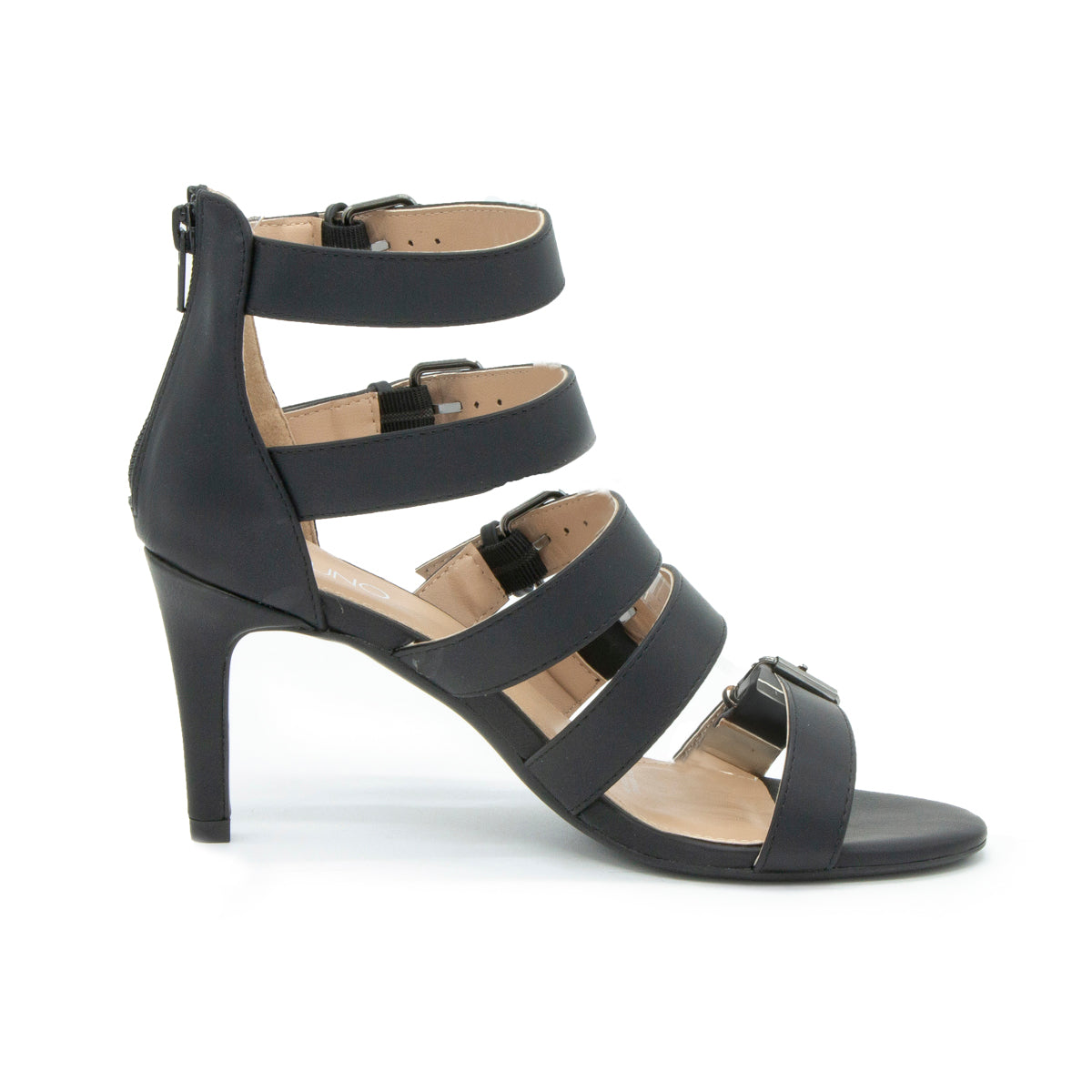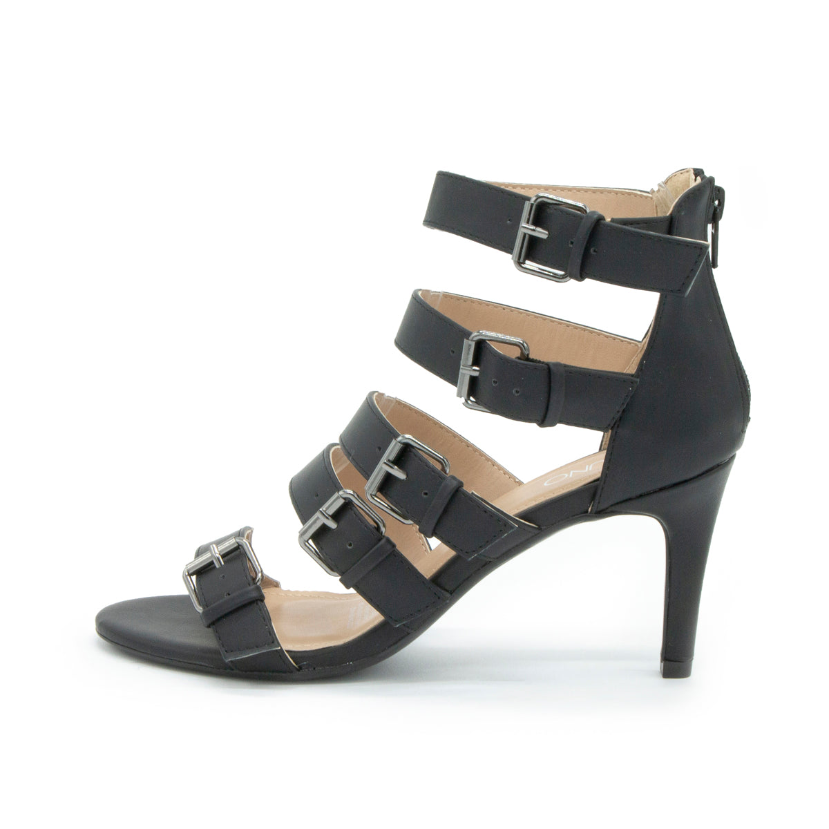 Esta sandalia de tacón alto se define por su diseño estructurado de múltiples tiras con hebillas metálicas, creando un efecto envolvente y moderno. Su silueta estilizada aporta carácter a cualquier look nocturno, manteniendo siempre una estética pulida y actual.